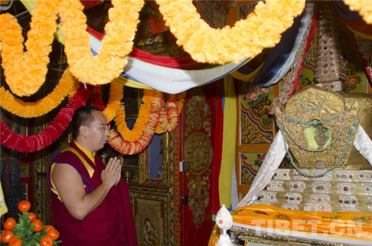 图为班禅在六世格达活佛灵塔前 摄影:欧帆
