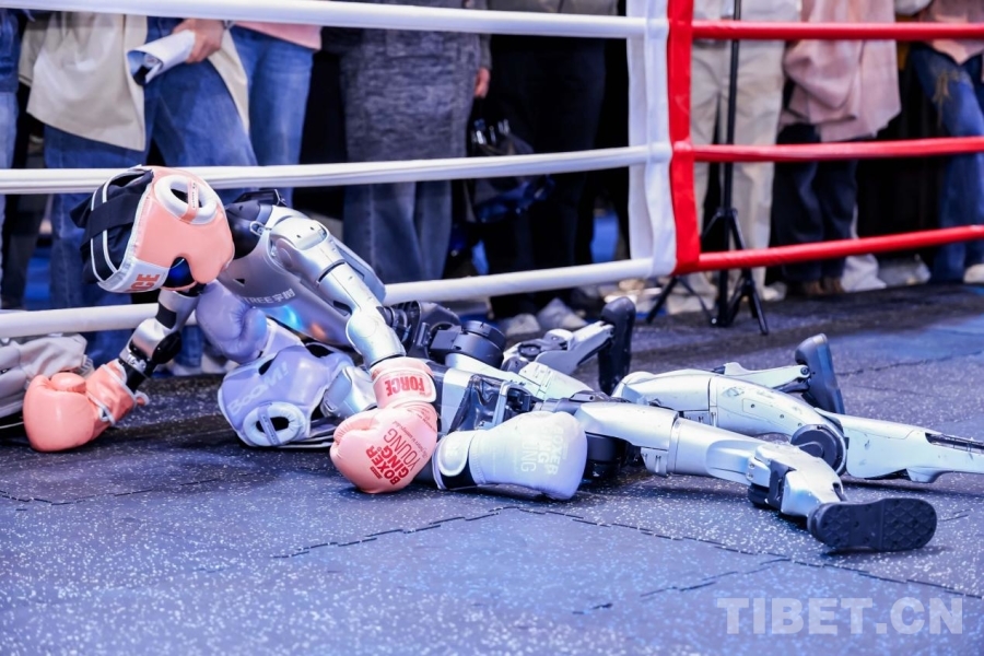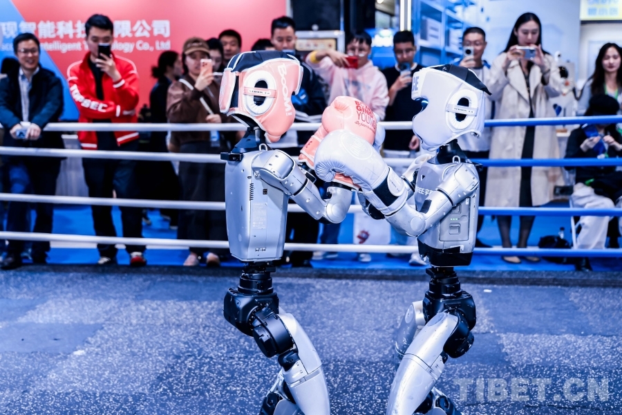 图为两位机器人拳手交替进攻,在灵活的站立攻防转换中彰显了最新的人工智能成果。