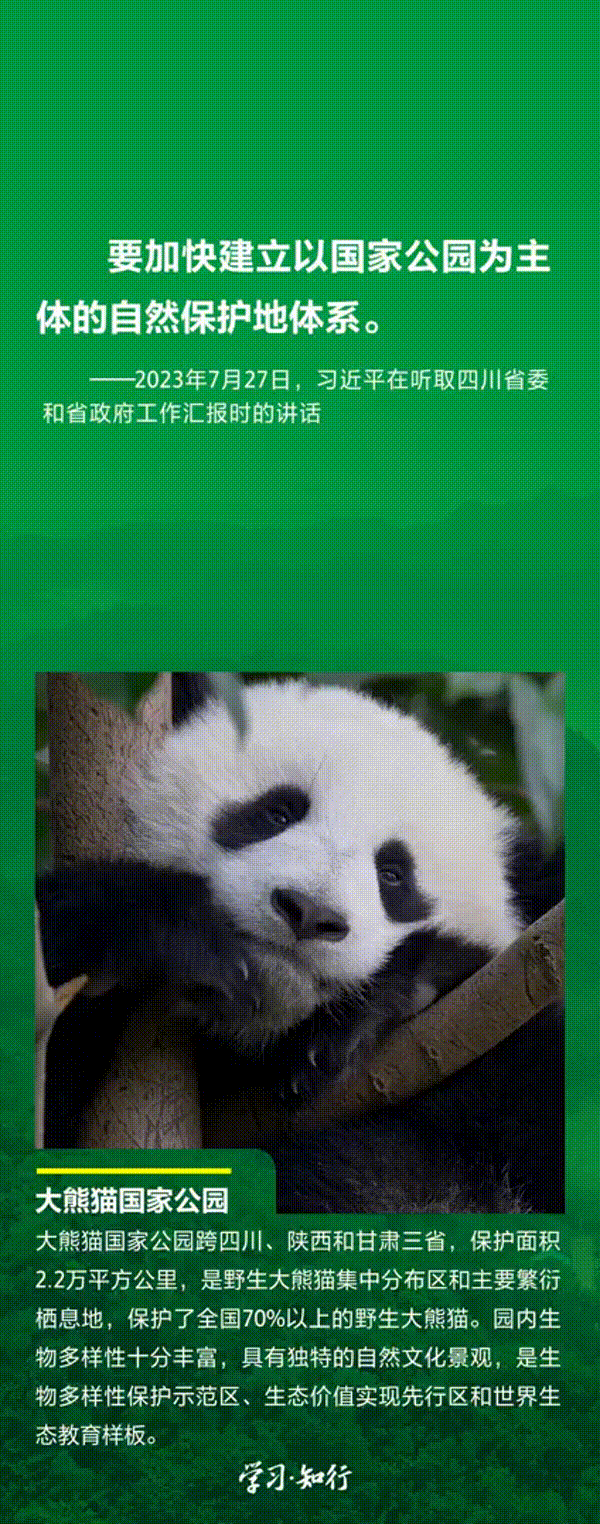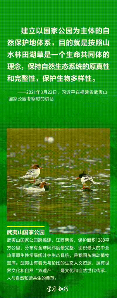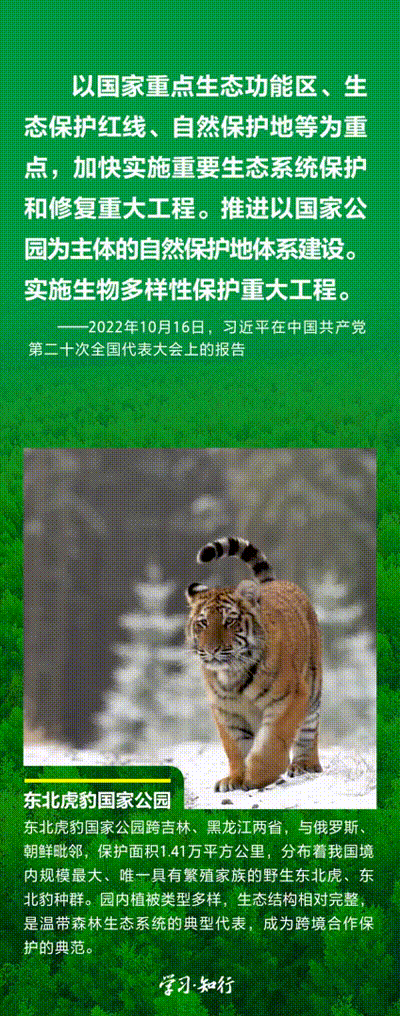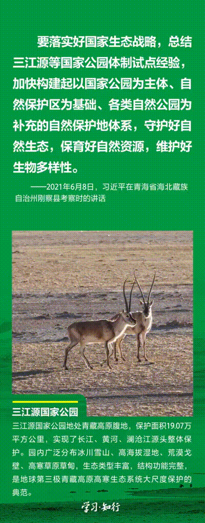 “生物多样性使地球充满生机,也是人类生存和发展的基础。”推进以国家公园为主体的自然保护地体系建设,是习近平总书记作出的重要部署。三江源、大熊猫、东北虎豹、海南热带雨林、武夷山等首批国家公园正式设立以来,生态功能持续向好,对保护生物多样性、推进人与自然和谐共生的现代化具有重要意义。