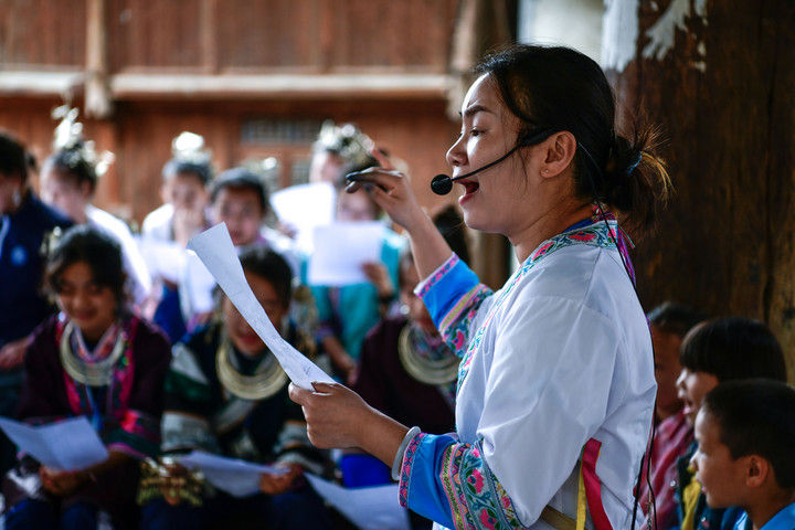2025年9月26日,内蒙古兴安盟科右中旗巴彦呼舒第六中学美术教师、非遗代表性传承人吴斯琴(左四)指导学生刺绣。近年来,内蒙古兴安盟科尔沁右翼中旗巴彦呼舒第六中学将当地国家级非遗图什业图刺绣引入校园,开设校本课程,并成立兴趣社团,在丰富校园文化生活的同时,让学生们近距离感受非遗的魅力,弘扬和传承中华优秀传统文化。随着国产动画电影《哪吒之魔童闹海》不断刷新中国影史票房纪录,参与电影配乐的贵州省榕江县三宝侗寨的杨想妮和“舞乐蝉歌”团队为更多人所熟知。乐团成员怀揣“用音乐传递侗族文化,让世界听见侗族大歌”的共同梦想,将侗族大歌推向更广阔的舞台。这是2025年4月22日,杨想妮在贵州省黎平县肇兴镇厦格侗寨教前来研学的孩子们唱侗歌。