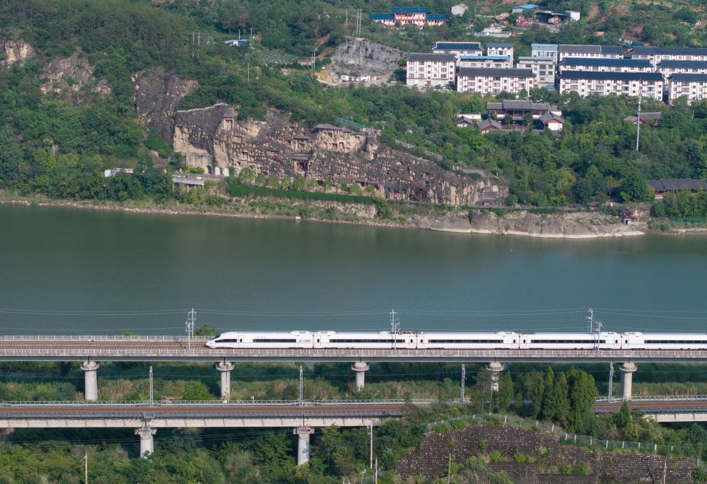 2025年7月18日,在四川省广元市千佛崖景区对面的嘉陵江畔,一列高铁列车运行在西成高铁上(无人机照片)。千佛崖脚下的金牛古蜀道和对岸的高铁列车,浓缩成一幅千年蜀道变迁图。