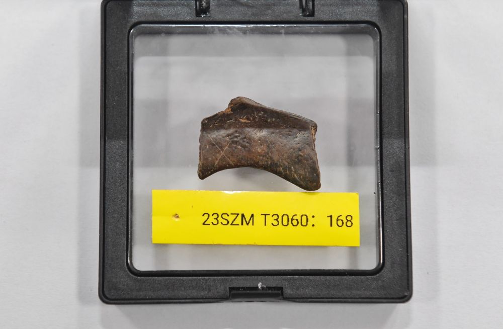 2023年12月5日拍摄的从四川资阳濛溪河遗址群出土的有X形划痕的骨器。该遗址是国际罕见的同时包含丰富石器、动物与植物遗存的“全科型”遗址,入选了“2024年度全国十大考古新发现”。