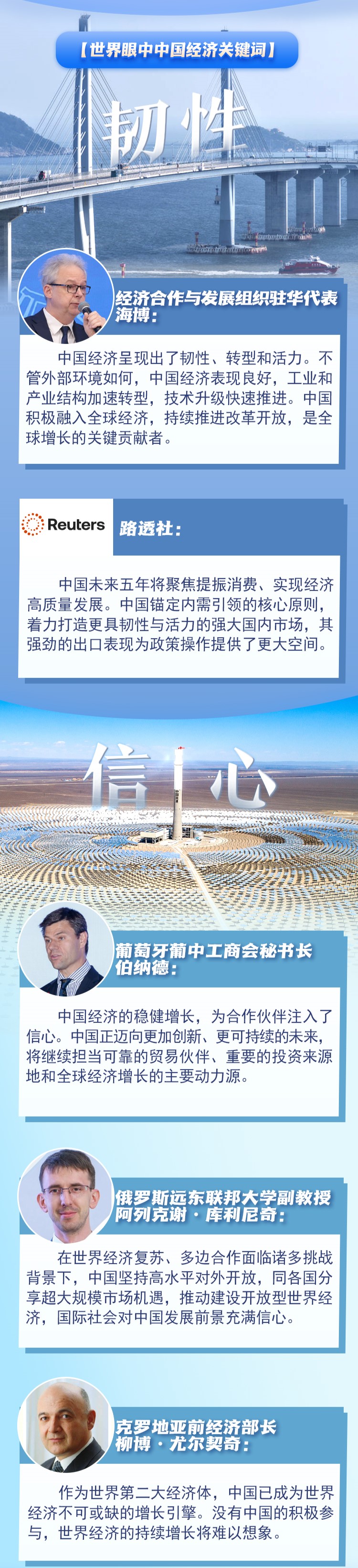 近期,多家国际机构上调中国经济增长预期,多国人士及媒体认为,中国是世界经济增长的重要引擎和创新前沿。韧性、信心、动力、开放,成为世界眼中的中国经济关键词。