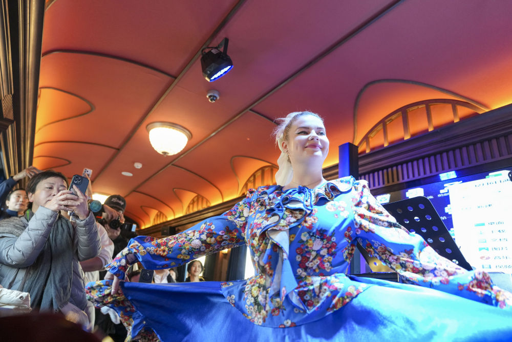 2025年12月6日,演员在黑龙江省“伊春号”旅游专列车厢中表演。当日,“伊春号”旅游专列投入试运行,40余名受邀体验的游客乘专列由哈尔滨站出发,去往亚布力滑雪旅游度假区。2025年以来,中国铁路哈尔滨局集团有限公司陆续开行了多趟旅游列车,将特色体验、民俗展示、定制化服务等进行融合,满足游客需求,服务旅客出行。
