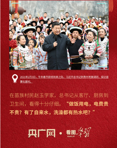 2020年底,贵州最后9个深度贫困县退出贫困县序列。次年2月,总书记就专程来到曾经的深度贫困村——贵州省毕节市化屋村。在苗族村民赵玉学家里,总书记看得仔细、问得真切,“做饭用电,电费贵不贵?有了自来水,洗澡都有热水吧?”一句句家常话,唠的是具体事,暖的是百姓心。