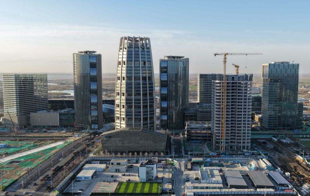 雄安商务服务中心是新区首个标志性城市建筑群,建筑风格以东方美学立体展现雄安特色风貌,功能包括酒店、专家公寓、商业等。2022年底,该中心投入使用。通过绿色建筑技术的集成与创新,这里实现了绿建三星标准全覆盖,项目预计每年可节约用电1100万度。这是2022年3月28日拍摄的雄安商务服务中心。