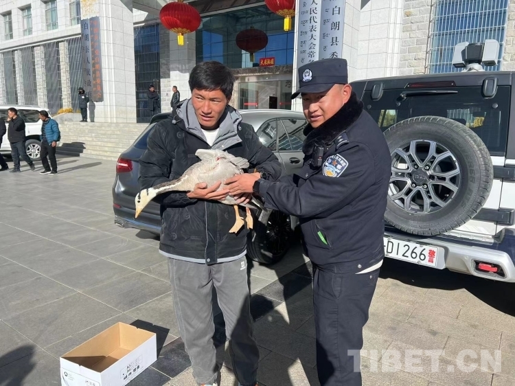 图为曲奴乡思布村村民扎顿将受伤的“斑头雁”交给派出所民警。