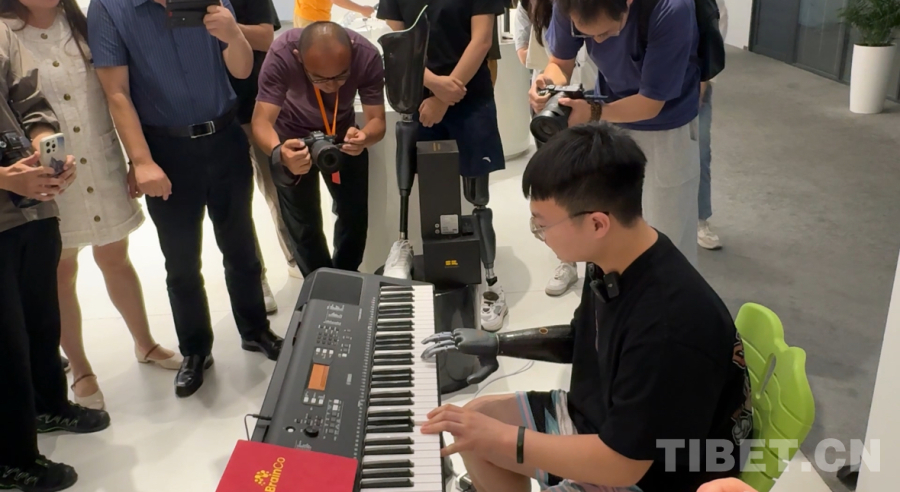 图为BrainCo强脑科技产品体验官周键在弹钢琴