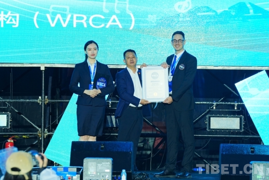 图为世界纪录认证机构(WRCA)代表为景区成功创造“世界最大的牦牛帐篷建筑”记录授牌
