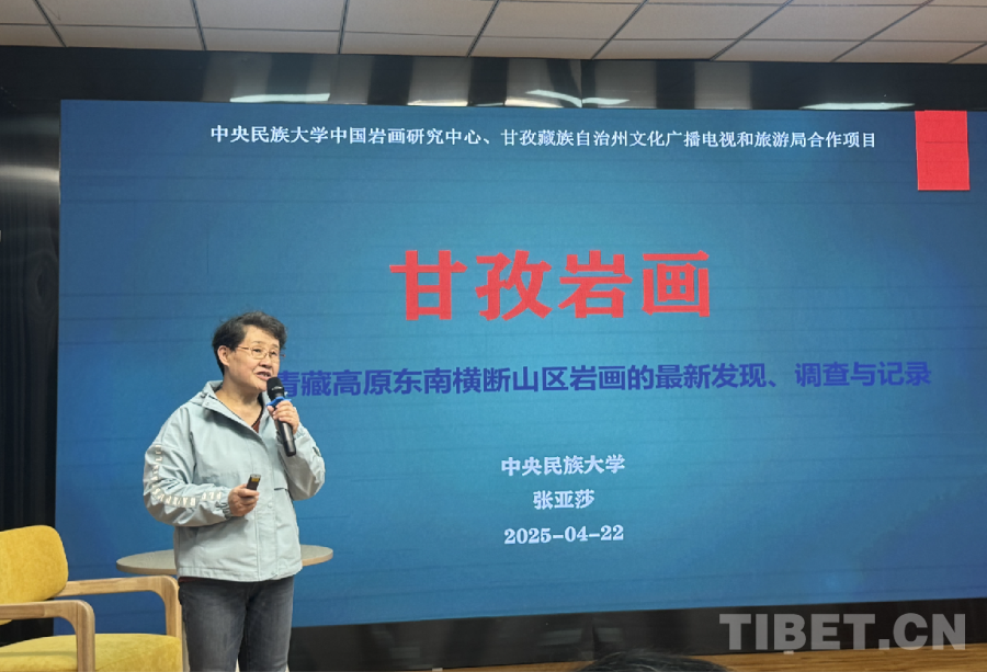 图为《甘孜岩画》主编、中央民族大学中国岩画研究中心教授张亚莎作分享