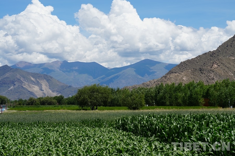 在才纳园区大田试种区域,河南农业大学农学院杨建平教授的科研助理王永峯正在观察玉米和小黑麦的生长情况。一望无际的玉米、小黑麦,株株都有一人高,绿油油的,和远处的青山、蓝天、白云相映成趣。