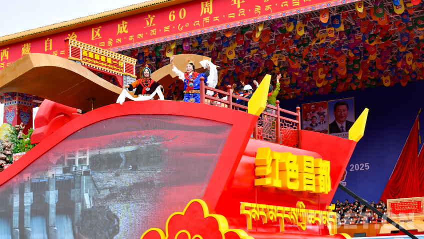 “旗帜引领”彩车,车头矗立巨型党旗,八面五星红旗有序排列其后,展现了在党中央坚强领导下,西藏各族儿女同心同向、团结奋进的时代图景。