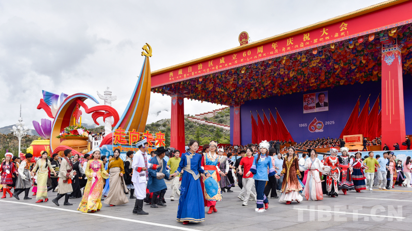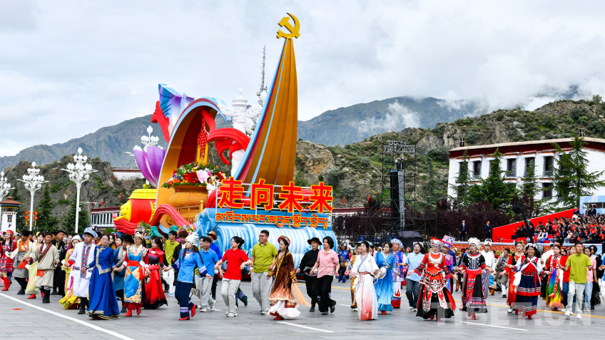 “走向未来”彩车,整体呈现数字“60”字样,车身造型融入华表、红色飘带、中国结等元素,彰显了西藏各族干部群众奋进新征程、建设团结富裕文明和谐美丽的社会主义现代化新西藏的信心和决心。(中国西藏网 记者/王淑 赵振宇 德吉卓玛 次旦拉姆 旦曲 贾华加 赵钊 姚浩然 刘莉 边子捷 冯重霖 杨眉笑)