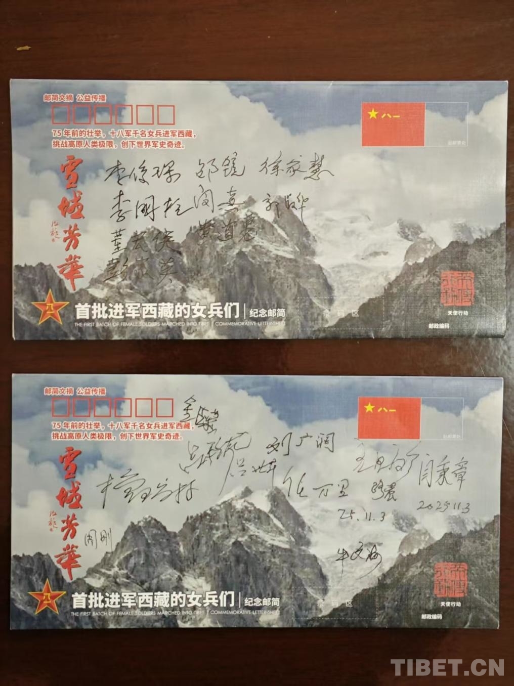 图为首批进藏女兵代表郭振华阿姨赠送纪念邮简