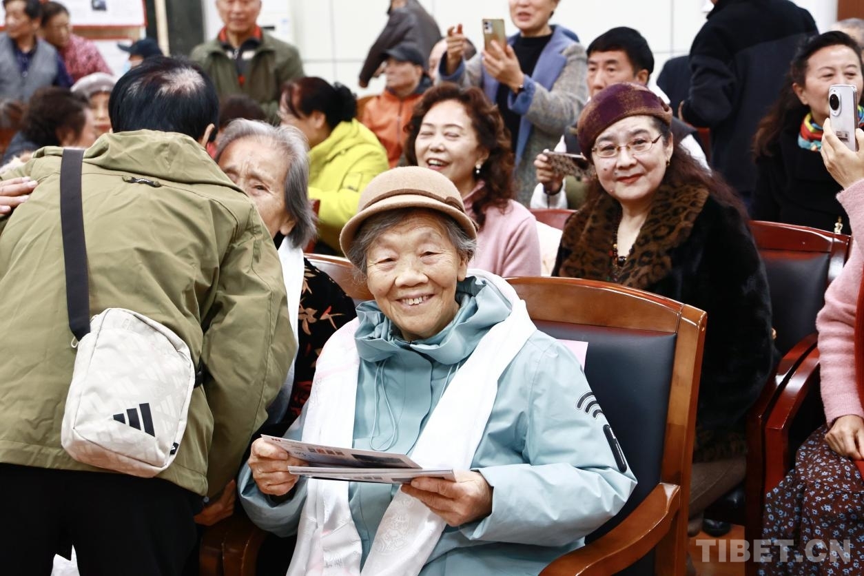 在热烈的掌声中,来自四川成都、双流、乐山、江油等地的十八军后代向首批进藏女兵敬献哈达。五位首批进藏女兵彭家英阿姨(97岁)、邵镜阿姨(95岁)、郭淑华阿姨(93岁)、董宏侠阿姨(98岁)、郭振华阿姨(95岁)向在蓉首批进藏女兵后代赠送了纪念邮简。