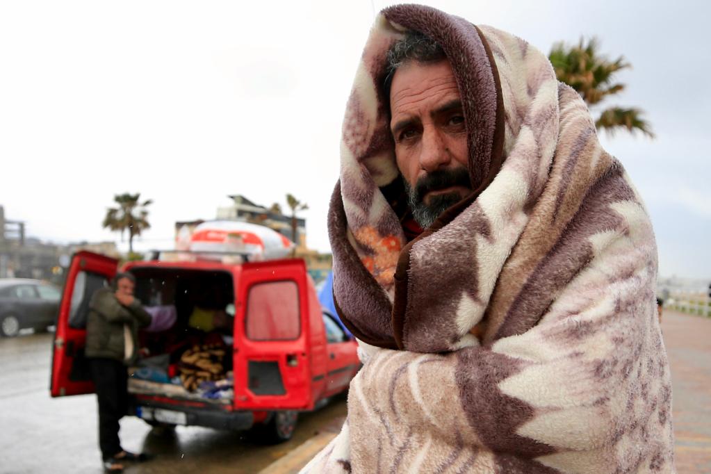 3月15日,在黎巴嫩南部赛达市附近的一条公路旁,一名黎巴嫩流离失所者用毯子御寒。新华社发(阿里·哈希绍摄)