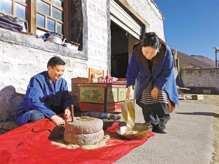 洛桑与曲旺用石磨研磨制作藏香所需的藏药材。