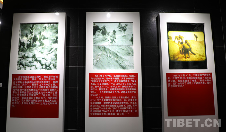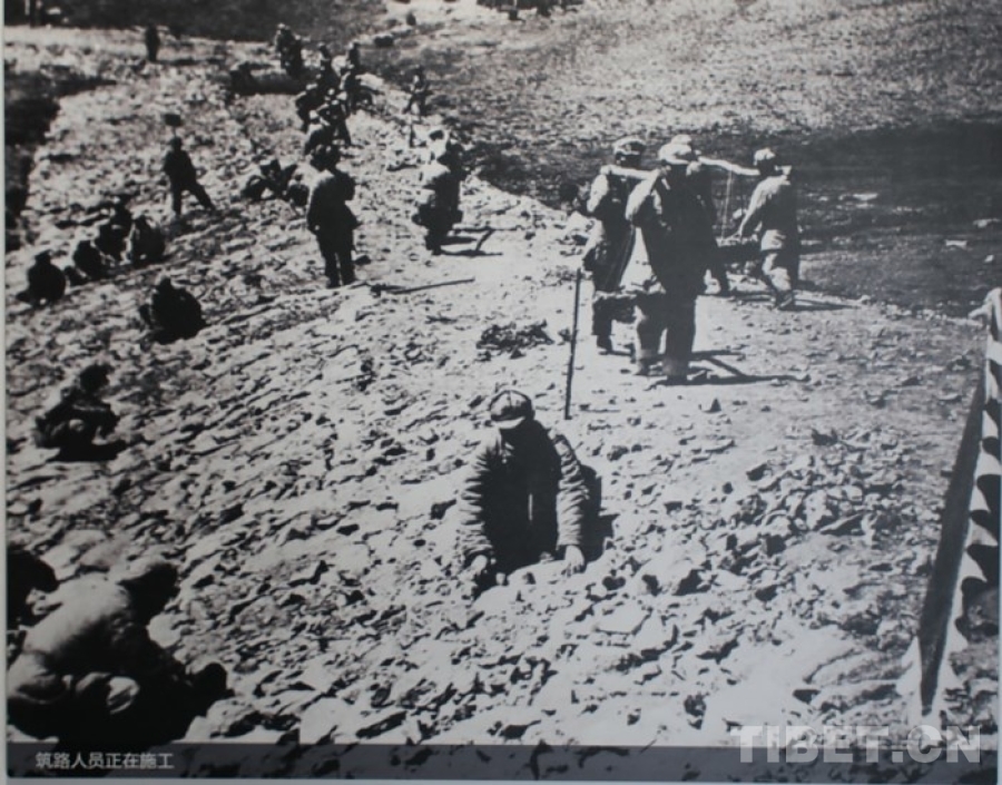 图为青藏公路纪念馆中展出图片:筑路人员正在施工 翻拍:王茜