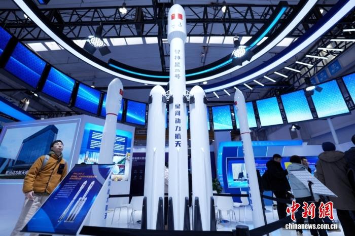 图为观众在星河动力航天展馆了解可重复使用液体运载火箭模型。 中新社记者 张祥毅 摄