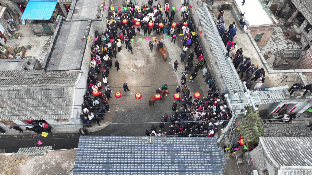 游客在下董寨村村中的小广场上观看跑马排活动。新华社记者 徐伟 摄