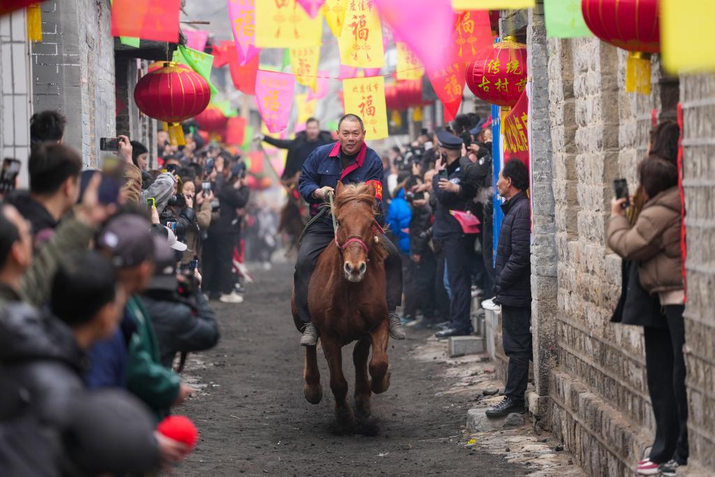 正月十六凌晨,记者一行就赶往下董寨村,“抢占”好位置。春寒料峭,晨雾还未散去,正式跑马前的准备活动已经开始。响头遍锣后,沿街的村民会把炉灰撒到青石街道上,以免马儿奔跑时四蹄打滑;二通锣响过,骑手们就飞身上马,完成一系列准备活动之后,便会骑马游街,接受大家的致意;三遍锣响,跑马正式开始。