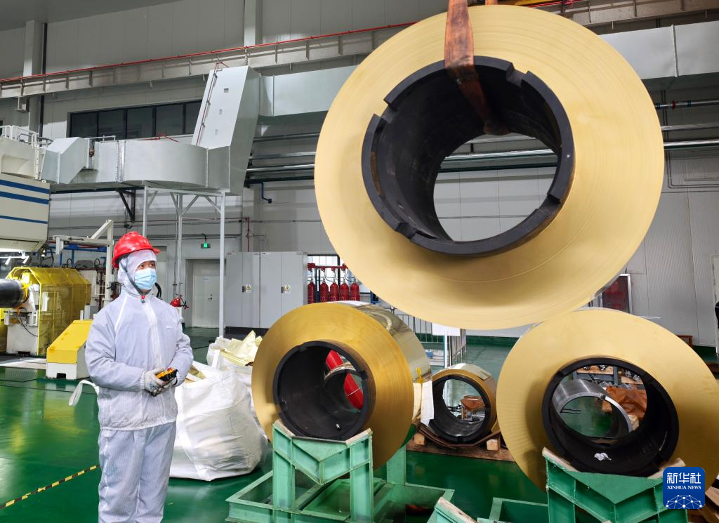 3月19日,工作人员在河南三门峡市灵宝金源矿业股份有限公司朝辉铜业箔轧车间进行吊装作业。新华社发(肖洋 摄)