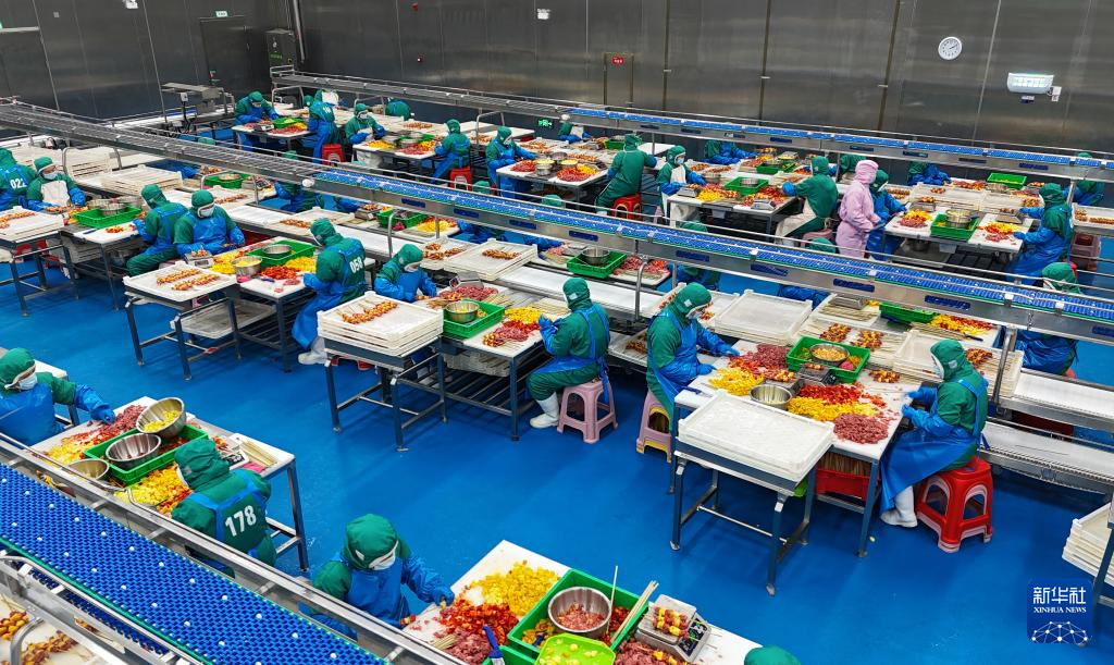 工作人员在河南鹿邑县茂源肉业穿串车间作业(资料照片)。新华社发