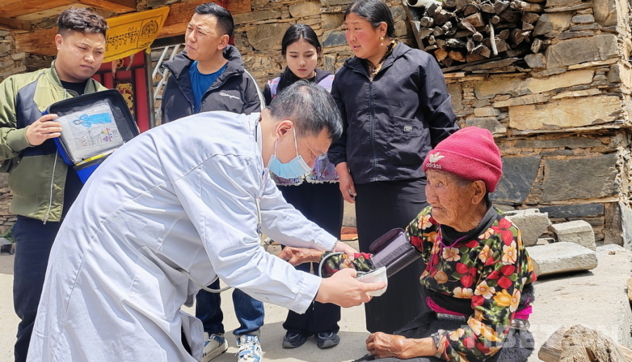 图为 “同心·共铸中国心”2025阿坝行大型健康公益综合服务活动义诊医疗专家在四川省阿坝州马尔康市草登乡入户巡诊,为行动不便的老人送医送药 摄影:喇应强