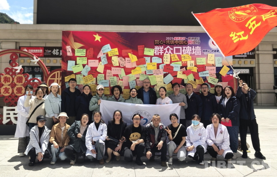 图为“同心·共铸中国心”2025阿坝行大型健康公益综合服务活动四川省阿坝州首府马尔康市义诊点的医疗专家们义诊结束后在群众口碑墙前留影 摄影:吉文革