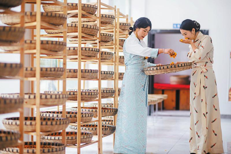 8月17日,阿坝州金川县二嘎里乡二嘎里村,返乡创业青年侯正琴(左)与唐辉在晾晒雪菊。通过直播带货等多种形式,高原雪菊已成为该村的特色产业。何海洋 摄