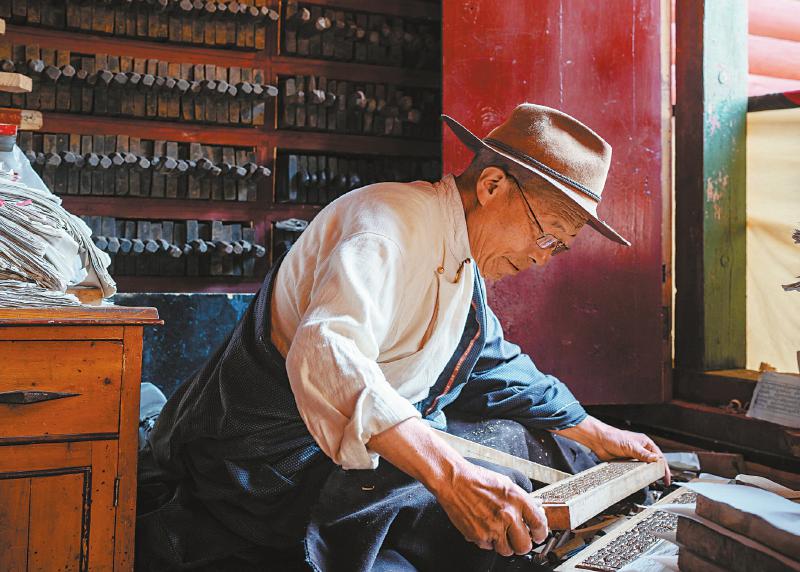 8月28日,甘孜州德格县德格印经院,69岁的彭措泽仁在校对修复雕版。作为德格印经院藏族雕版印刷技艺的代表性传承人,他已从事这项工作40余年。何海洋 摄