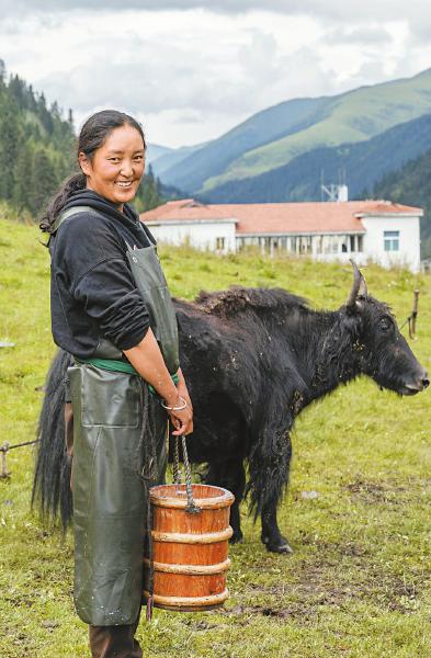 8月17日,阿坝州金川县毛日乡毛日村,村民蒲尔巴拉姆在牧场采集牦牛奶。采集的鲜奶会及时送至牛奶加工厂,为家里增加一笔可观的收入。何海洋 摄