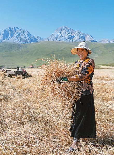 8月25日,甘孜县仁果乡有机青稞基地,联合收割机完成收割后,德西青措将青稞秸秆打捆。今年她家的青稞再次增产。何海洋 摄