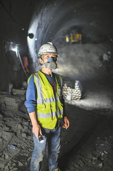 8月13日,值班长陈亮在西宁至成都铁路四川段红原2号隧道内。他每日往返洞内数十次,工作超10小时,主要负责观察施工情况及人员调度。何海洋 摄