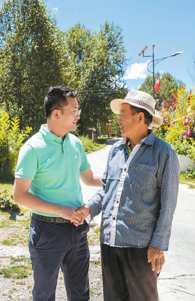 8月21日,甘孜州炉霍县雅德乡交纳村“博士名誉村长”张藜山(左)与村民拉家常。自去年担任“村长”以来,他致力于发展电商和旅游产业,成为乡村振兴的“新引擎”。何海洋 摄