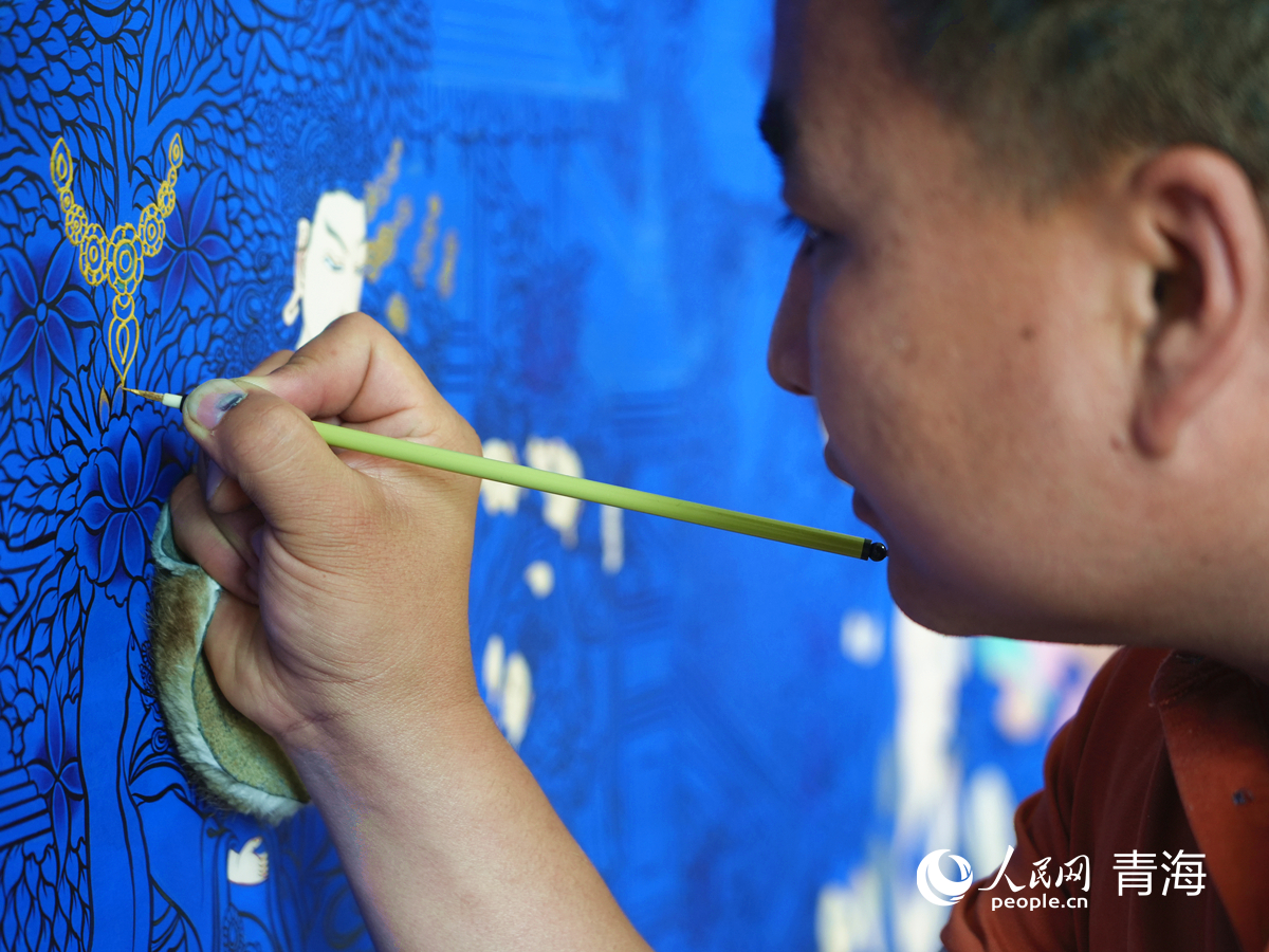 仁俊画院画师正在创作援青主题唐卡作品。人民网记者 杨启红 摄