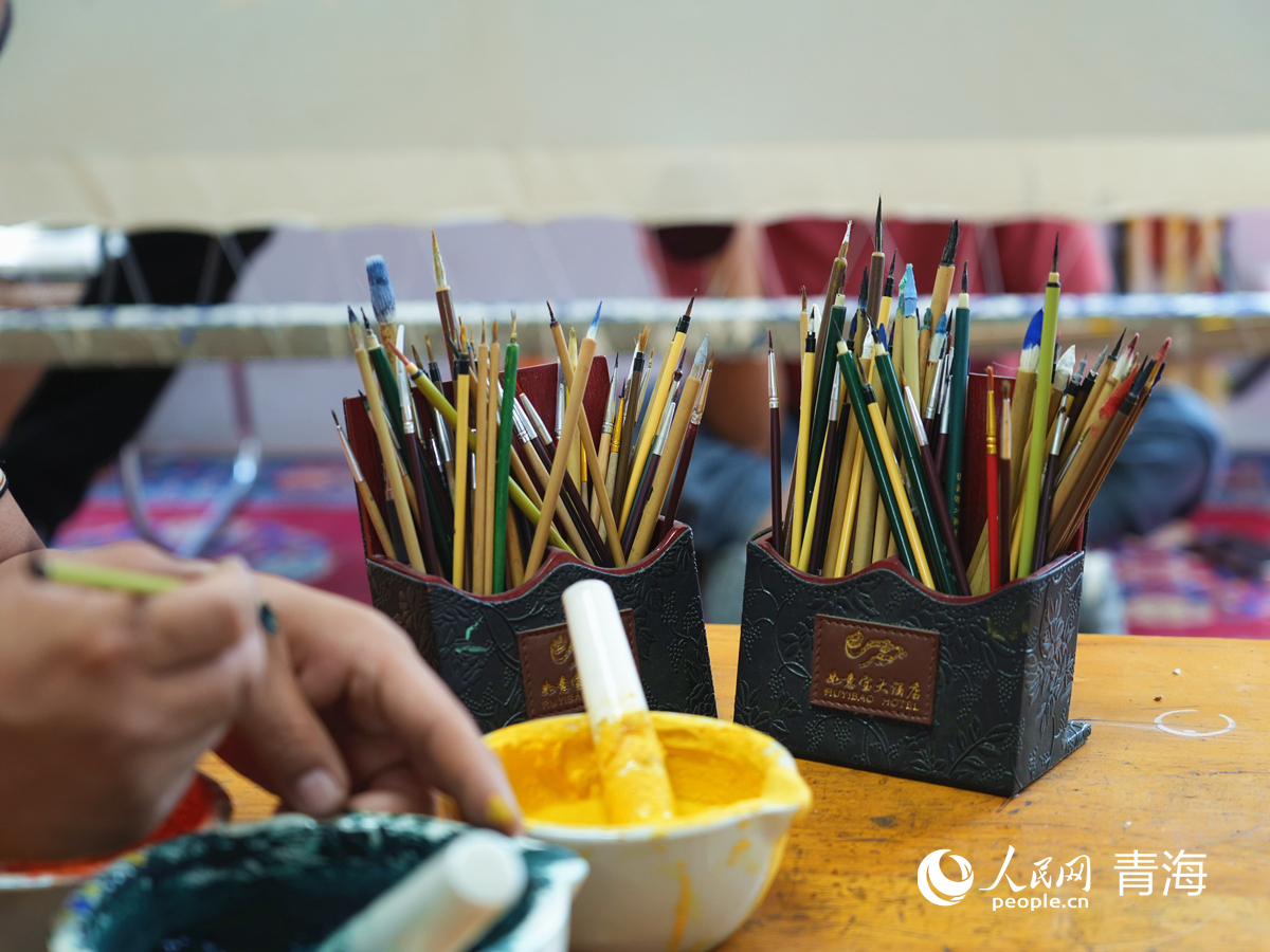绘制唐卡,需要多种笔和颜料。人民网记者 杨启红 摄