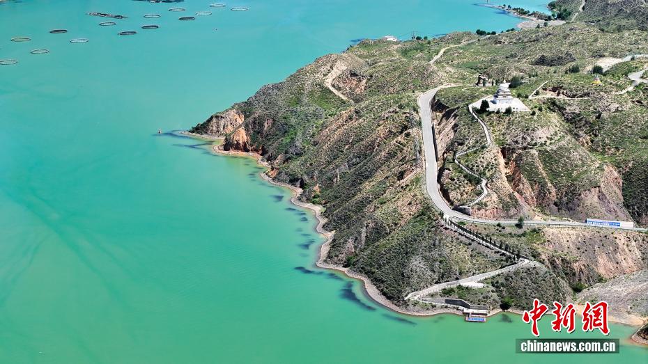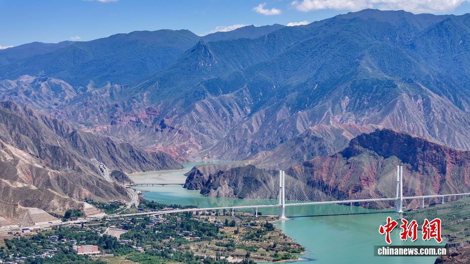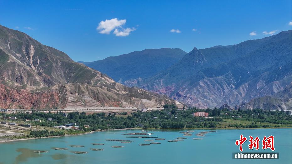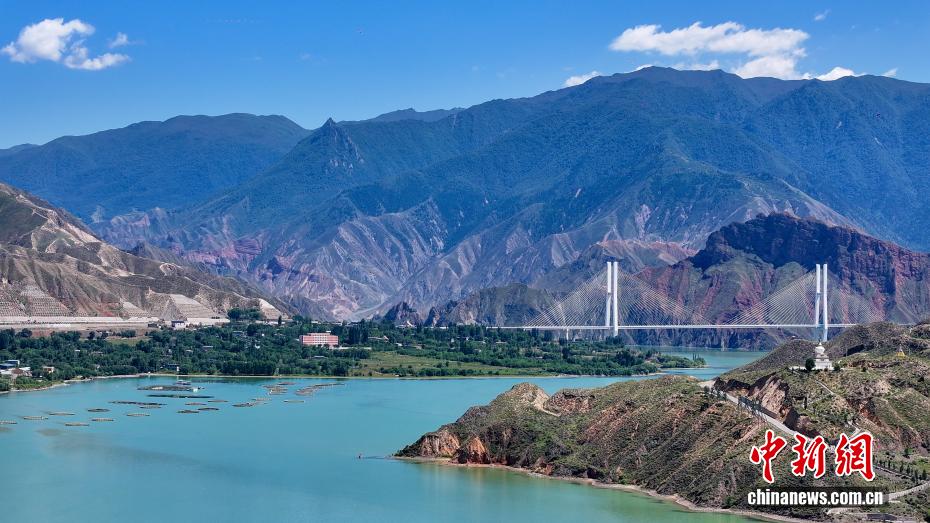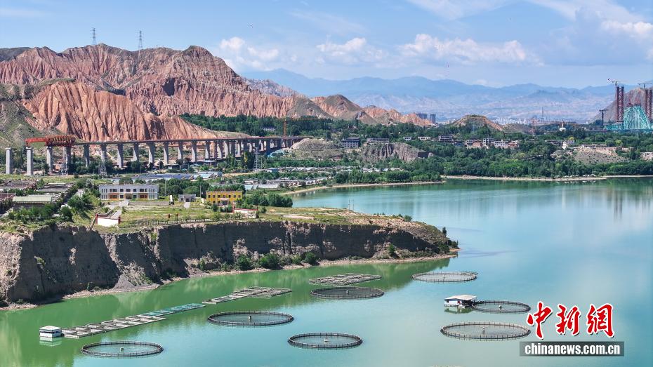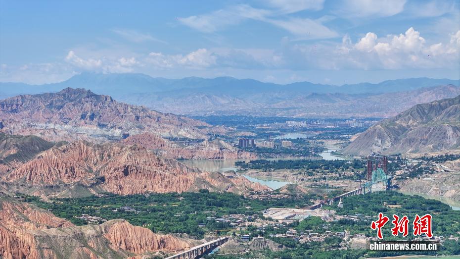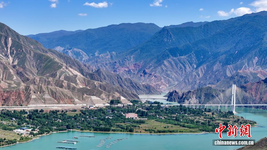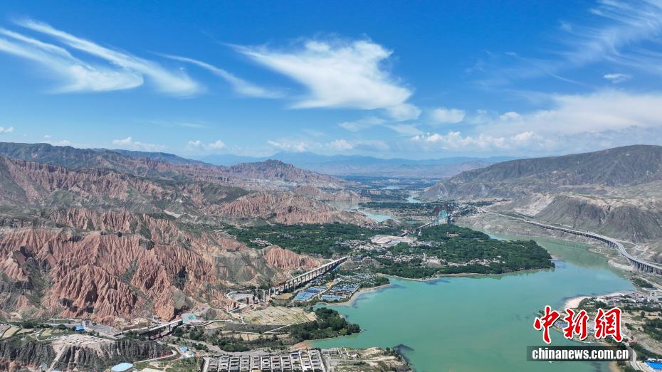 7月26日,航拍青海省黄南藏族自治州尖扎县德吉村黄河沿岸风光,碧绿的河水与远处丹霞地貌相映成趣。(无人机照片)中新社记者 薛蒂 摄