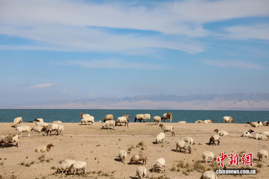 10月22日,青海省海南藏族自治州共和县青海湖畔,羊群悠闲觅食。中新社记者 马铭言 摄