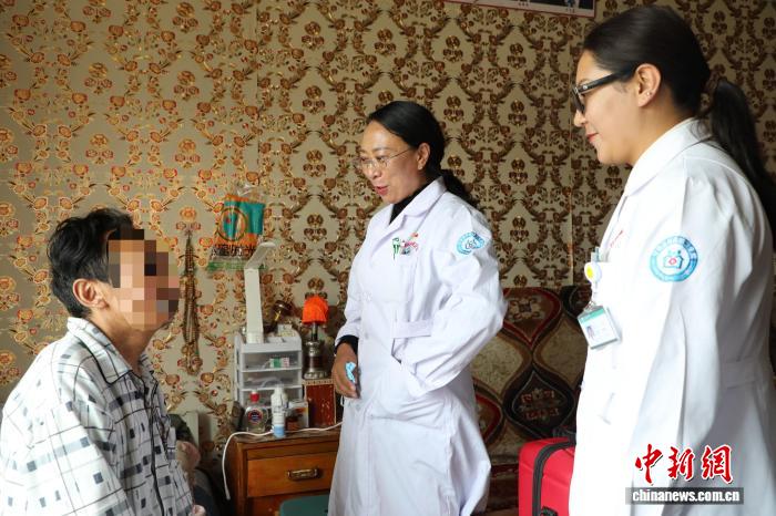 图为尼玛拉毛(右二)与同事入户为当地村民诊治。马铭言 摄