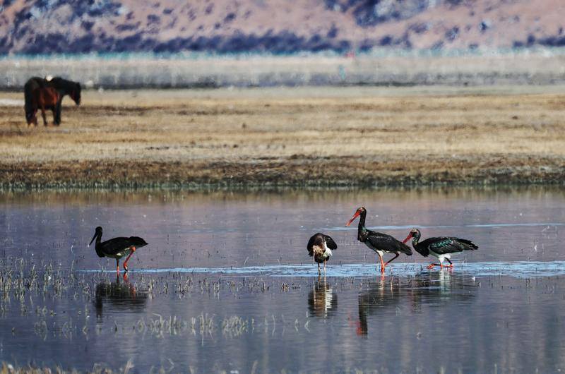 2月2日是第30个“世界湿地日”。在云南省迪庆藏族自治州香格里拉的纳帕海湿地,一幅生动的生态画卷正在展开:成群的黑颈鹤与黑鹳在浅水区悠然觅食,各类野鸭在湖中巡游,斑头雁划过长空。