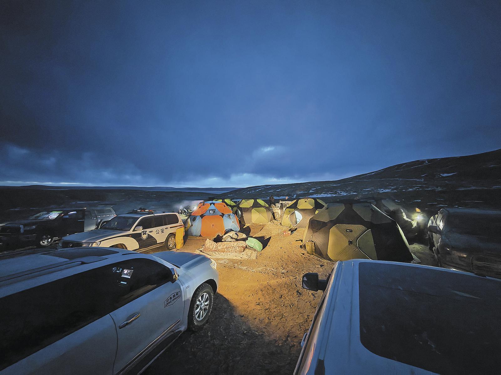 巡山夜幕下的营地。