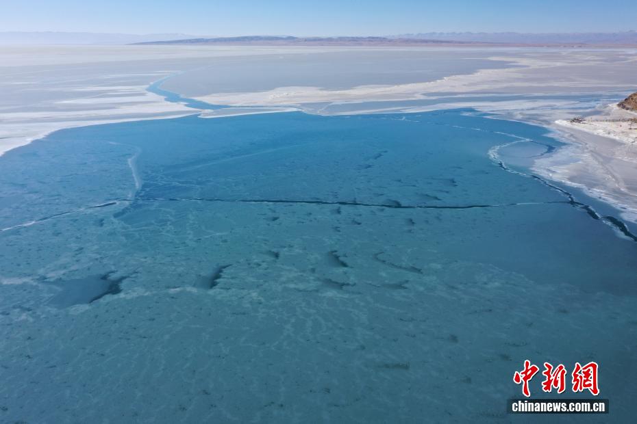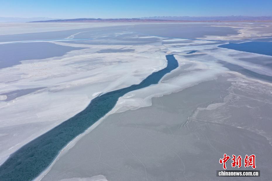 2月13日,青海省海北藏族自治州刚察县圣泉湾景区,中国最大的内陆咸水湖青海湖已进入封冻期。昔日碧波荡漾的湖面被厚冰覆盖,冰裂纹理如大地墨痕,与远处高山相映成画,尽显高原冬日的静谧。(无人机照片)中新社记者 张忠苹 摄