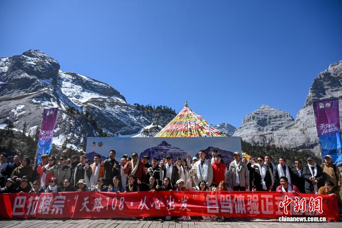 3月11日,巴拉格宗景区创始人斯那定珠(左一)为首批体验自驾的游客献哈达。中新社记者 李嘉娴 摄