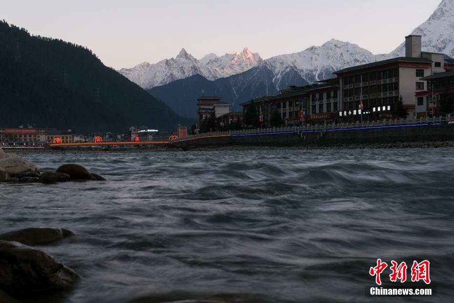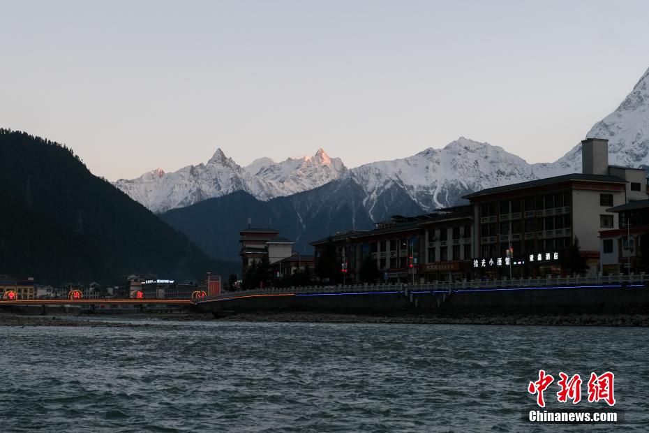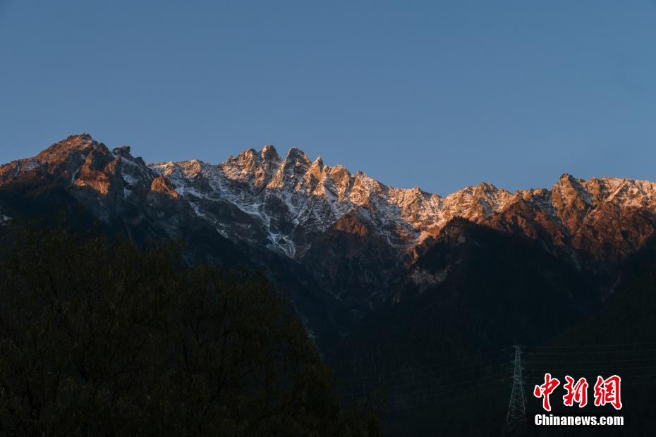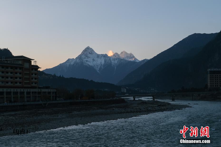 西藏自治区林芝市波密县高山绵延、河流纵横,拥有青藏高原最大的冰川聚集地,县域境内冰川超过2000座,被誉为“冰川之乡”。图为12月14日,夕阳照在波密县城周边的雪山顶上,出现“日照金山”的景象。