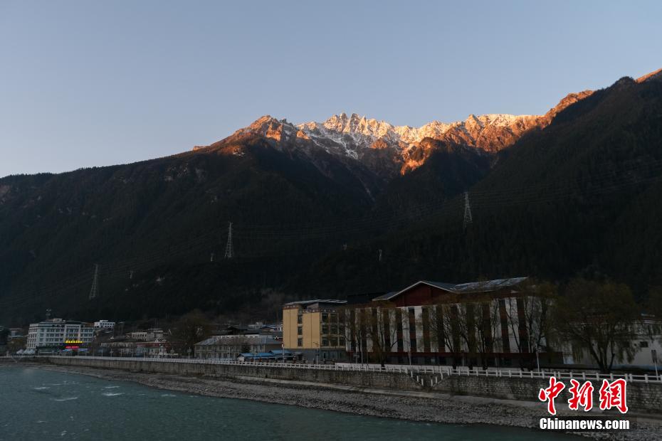 西藏自治区林芝市波密县高山绵延、河流纵横,拥有青藏高原最大的冰川聚集地,县域境内冰川超过2000座,被誉为“冰川之乡”。图为12月14日,金色的夕阳照在波密县城周边的雪山顶上。