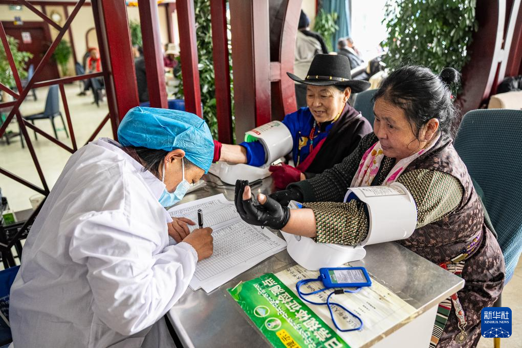 4月25日,在那曲市色尼区老年人日间照料中心,老人在测量血压。新华社记者 丁增尼达 摄
