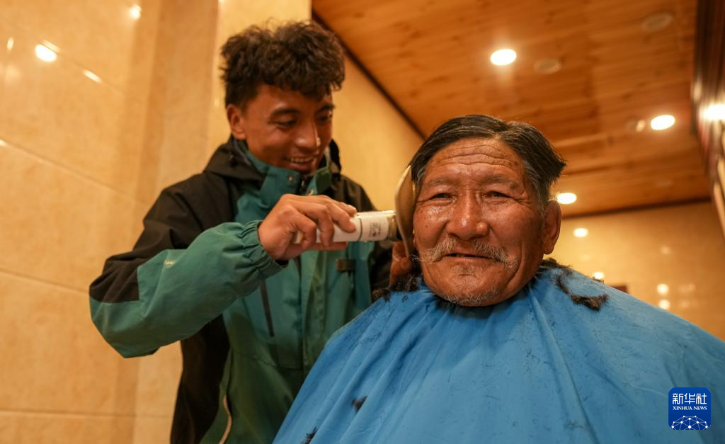4月25日,那曲市色尼区老年人日间照料中心的工作人员为老人理发。新华社记者 晋美多吉 摄