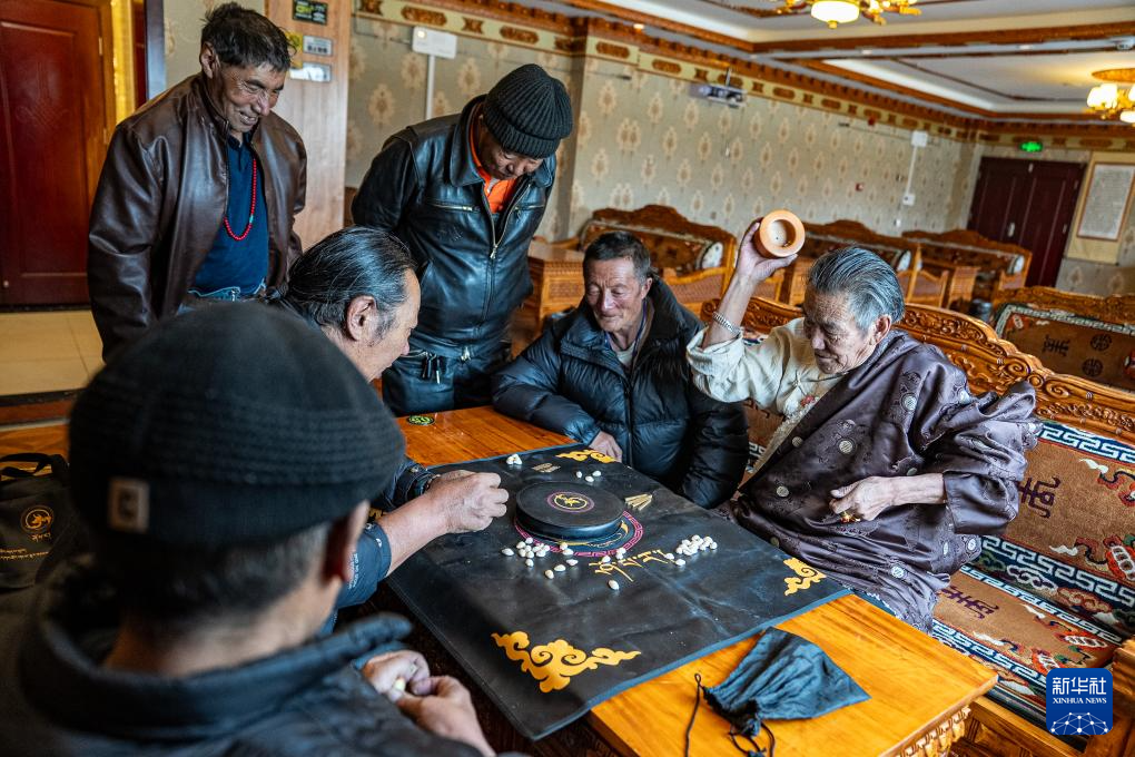 4月25日,老人们在那曲市色尼区老年人日间照料中心玩藏式骰子。新华社记者 丁增尼达 摄