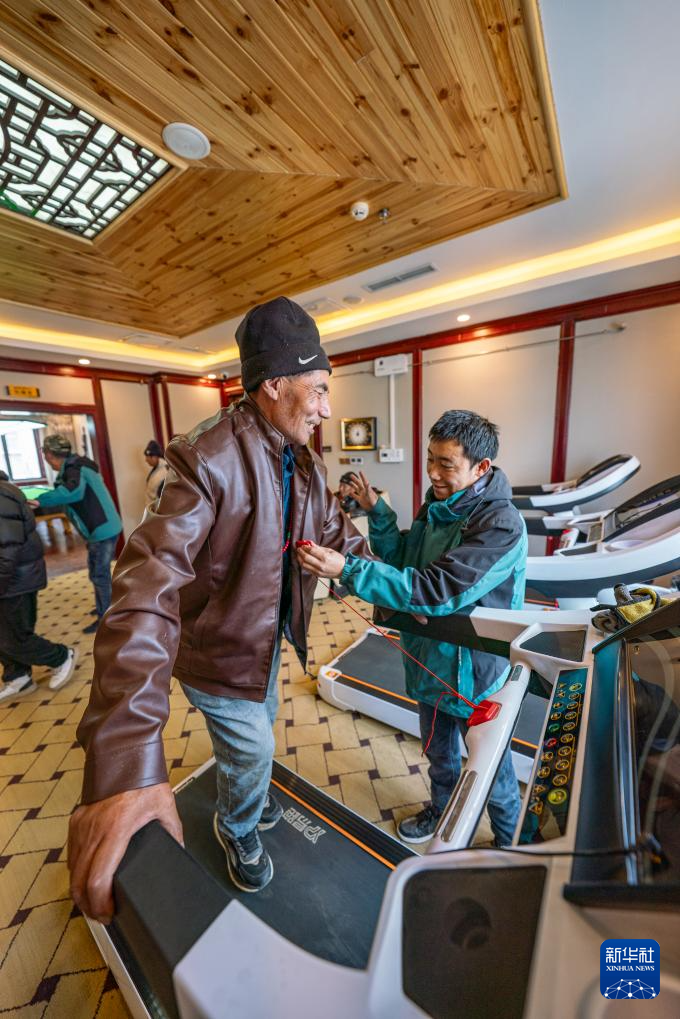 4月25日,在那曲市色尼区老年人日间照料中心,工作人员陪同老人在跑步机上做运动。新华社记者 丁增尼达 摄